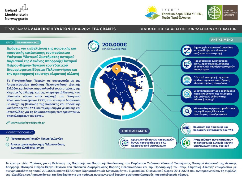 Στην Πελοπόννησο, το Πανεπιστήμιο Πατρών, σε συνεργασία με την αποκεντρωμένη διοίκηση Πελοποννήσου, δυτικής Ελλάδας και Ιονίου, παρακολουθεί τις επιπτώσεις της κλιματικής αλλαγής και της υπερεκμετάλλευσης των υδατικών πόρων στην περιοχή τού Υπόγειου Υδατικού Συστήματος (ΥΥΣ) του ποταμού Λαρισσού, με στόχο τη βελτίωση της ποιοτικής και ποσοτικής κατάστασης του ΥΥΣ και τη δημιουργία γεωπύλης και ιστοσελίδας για τη δημοσιοποίηση των ερευνητικών αποτελεσμάτων του έργου.