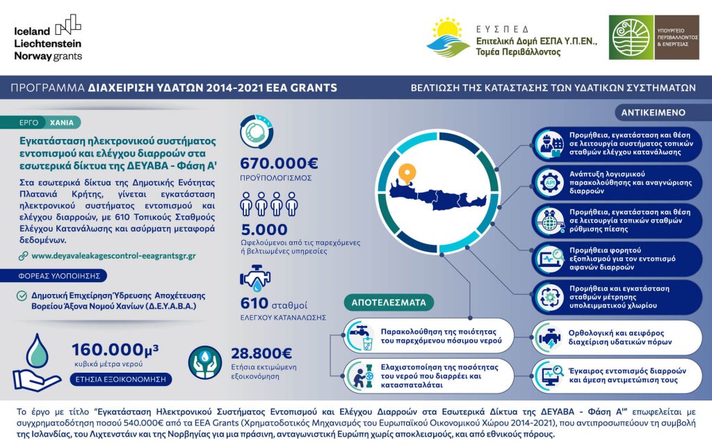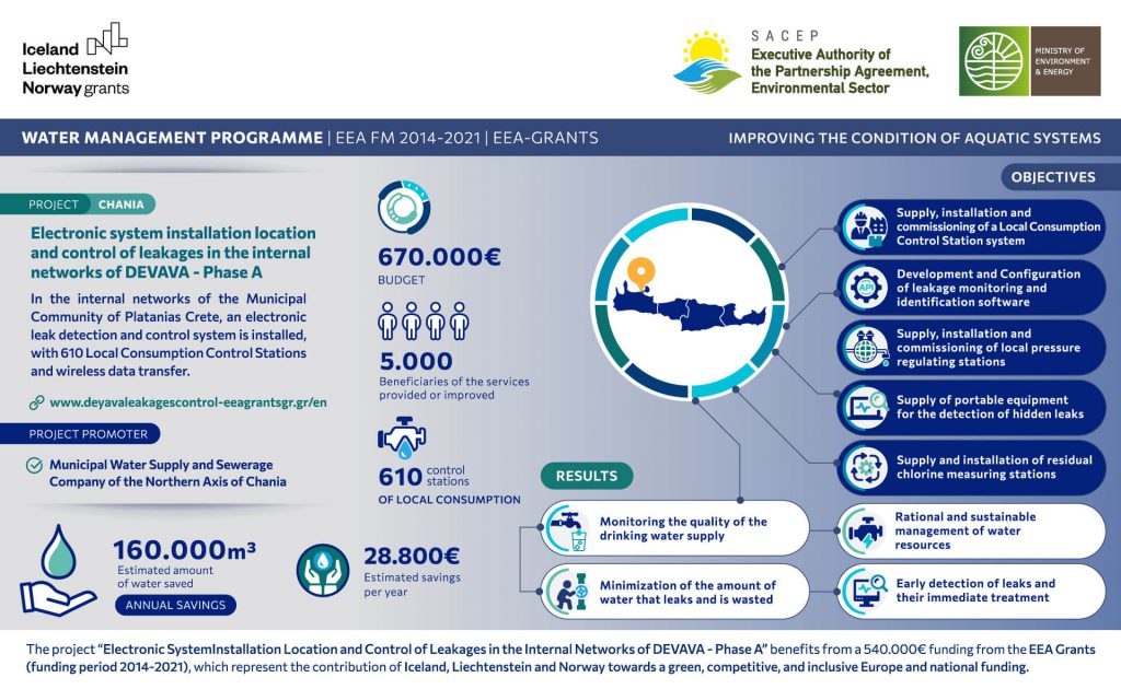 Στα εσωτερικά δίκτυα της δημοτικής κοινότητας Πλατανιά Κρήτης, γίνεται εγκατάσταση ηλεκτρονικού συστήματος εντοπισμού και ελέγχου διαρροών, με 610 Τοπικούς Σταθμούς Ελέγχου Κατανάλωσης και ασύρματη μεταφορά δεδομένων.