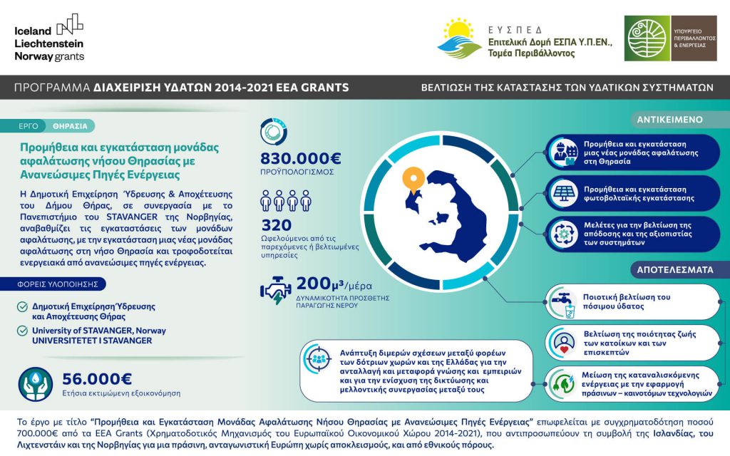 Στον δήμο Θήρας, η Δημοτική Επιχείρηση Ύδρευσης και Αποχέτευσης, σε συνεργασία με το Πανεπιστήμιο του Stavanger της Νορβηγίας, αναβαθμίζει τις εγκαταστάσεις των μονάδων αφαλάτωσης, με την εγκατάσταση μιας νέας μονάδας αφαλάτωσης στη νήσο Θηρασία και την κάλυψη της καταναλισκόμενης ενέργειάς της από ανανεώσιμες πηγές ενέργειας.