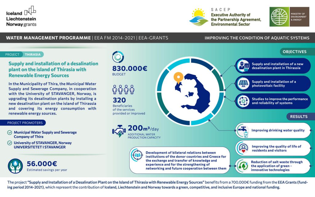 In the Municipality of Thira, the Municipal Water Supply and Sewerage Company has collaborated with the University of Stavanger, Norway to upgrade its desalination plants. The plan has involved the installation of a new desalination plant on the island of Thirassia and powering its energy consumption with renewable energy sources.